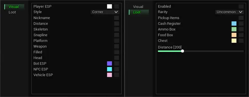 Dullwave is an advanced visual cheat for Fortnite featuring a full ESP system. Displays players, bots, NPCs, vehicles, and loot with detailed information including nickname, distance, weapon, platform, and rarity. Supports Corner and 2D box styles, skeleton ESP, snaplines, and head highlighting. Provides full map awareness and tactical advantage in every match.
