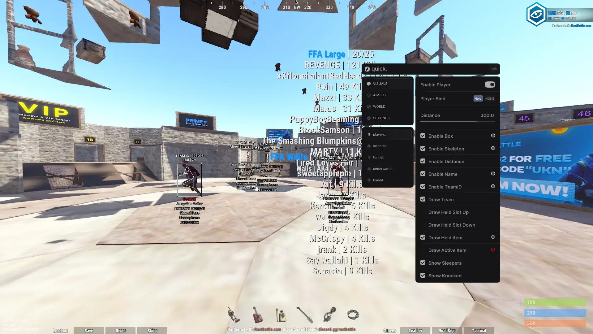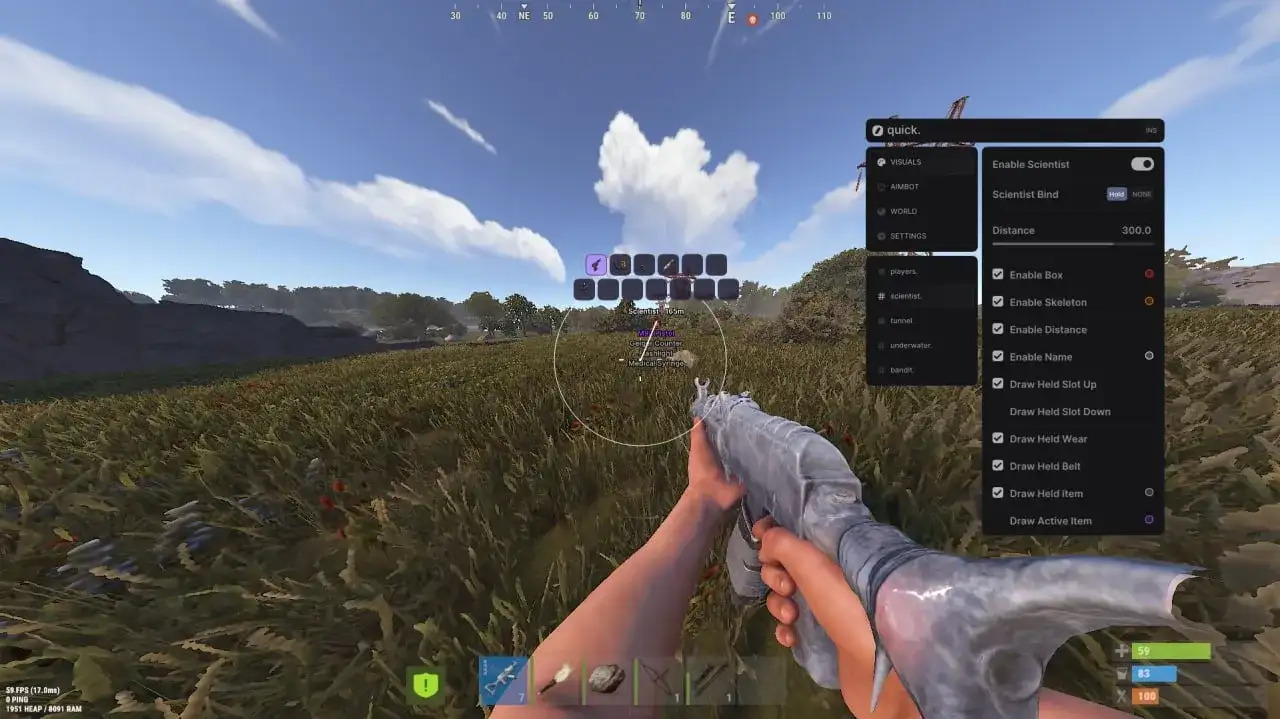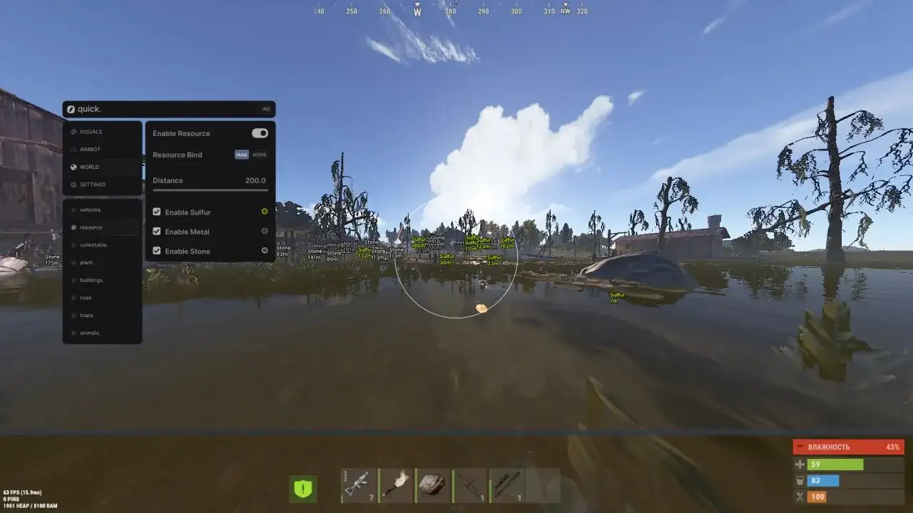 Quick private cheat for Rust with powerful ESP, Vector/Silent aimbot, and advanced visual settings. It supports player, NPC, resource, vehicle, loot, trap, animal, and building ESP. Also includes FOV changer, Always Day, Debug camera, and weapon features.