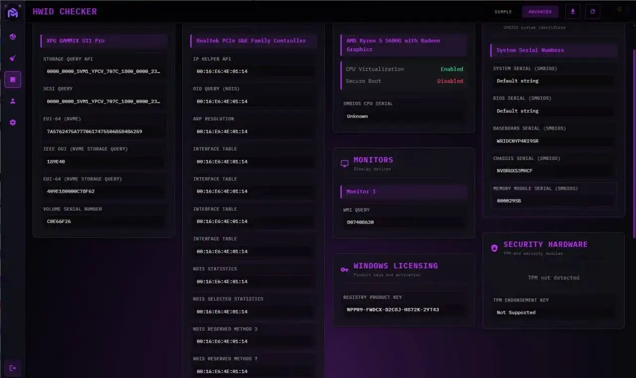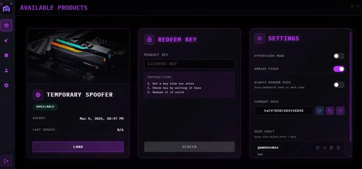 Private spoofer for anti-cheats: ACE / EAC / BE and games: Rust, Arena Breakout, Arc Raiders, Delta Force. Built-in cleaner and serial number check - Works via Hypervisor.